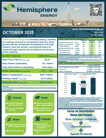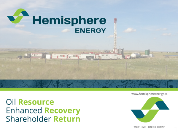 Our latest presentation is where you will find the most up-to-date information on Hemisphere’s operations and strategy. If you would like more information, Don Simmons is available to provide virtual presentations to groups of investors.